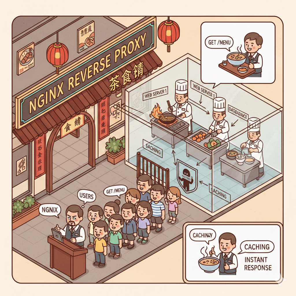 想像一下你開咗間好火紅嘅茶餐廳。 以前細舖嗰陣,客入到嚟直接搵老細(Server)落單就得。 但而家生意太大,你請咗個超勁嘅部長企喺門口,呢位部長就係 Nginx Reverse Proxy。